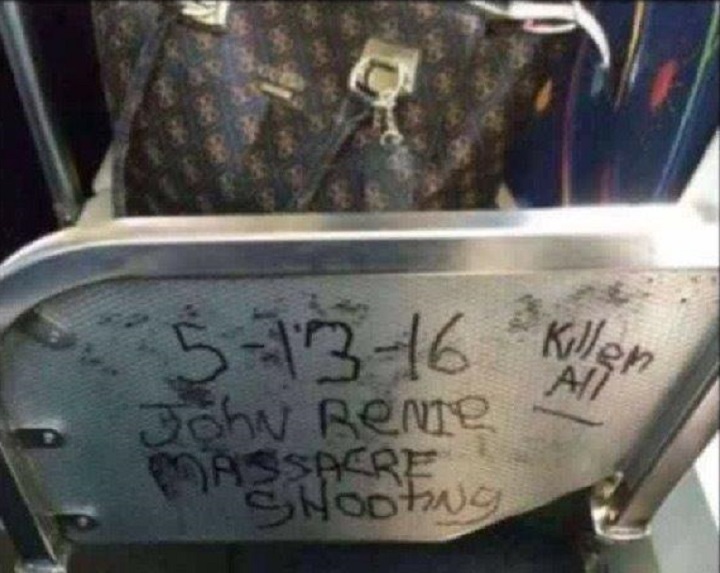 The message was scrawled on a city bus and reads “John Rennie massacre shooting – kill them all” and lists Friday’s date.