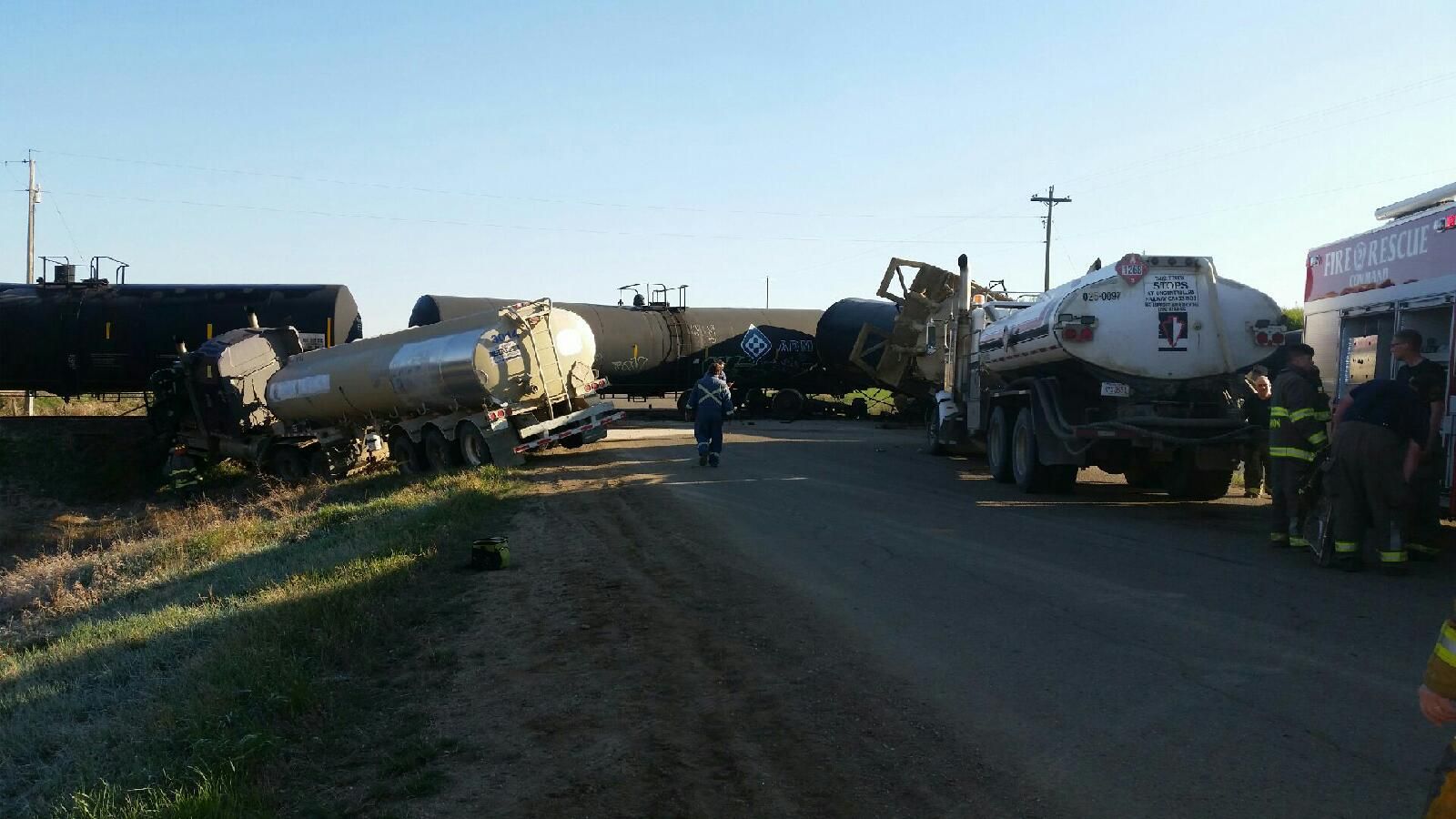 A second fluid hauler was then hit by the first truck, which rolled and ended up upside down in the ditch. After that, a third fluid hauler hit the train and ended up in the ditch.