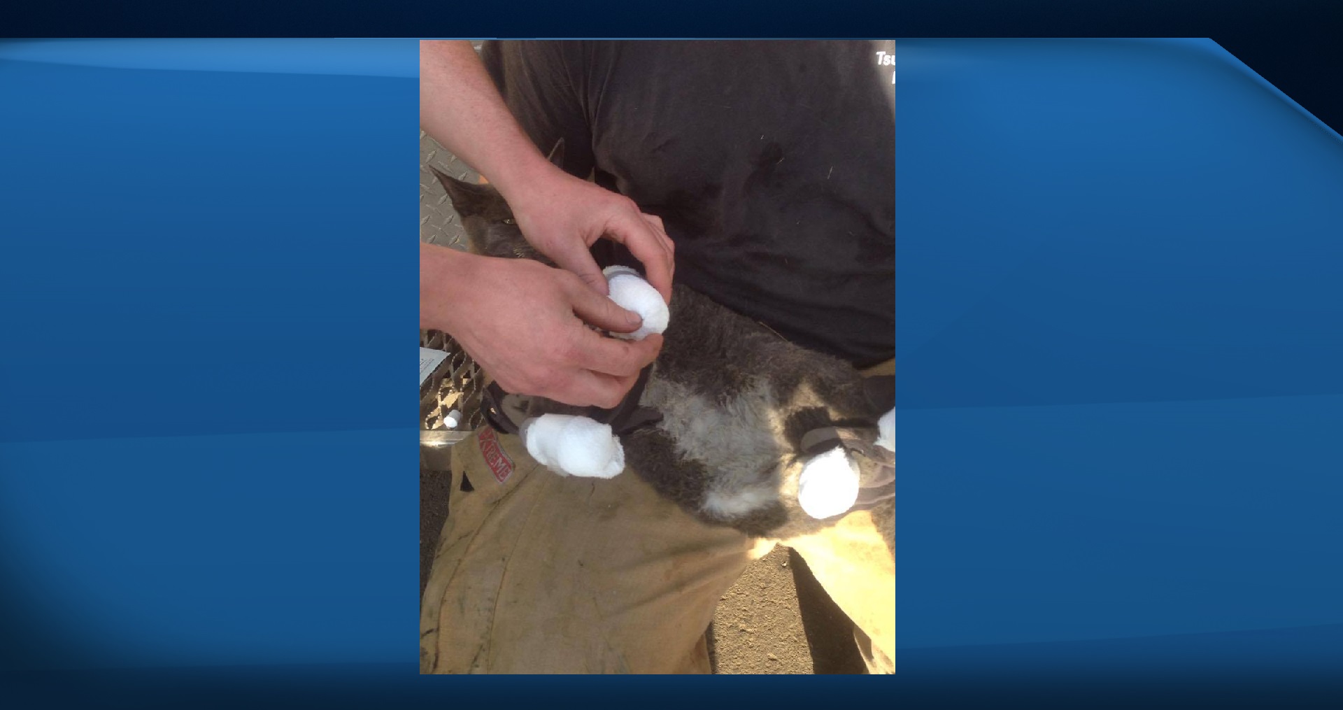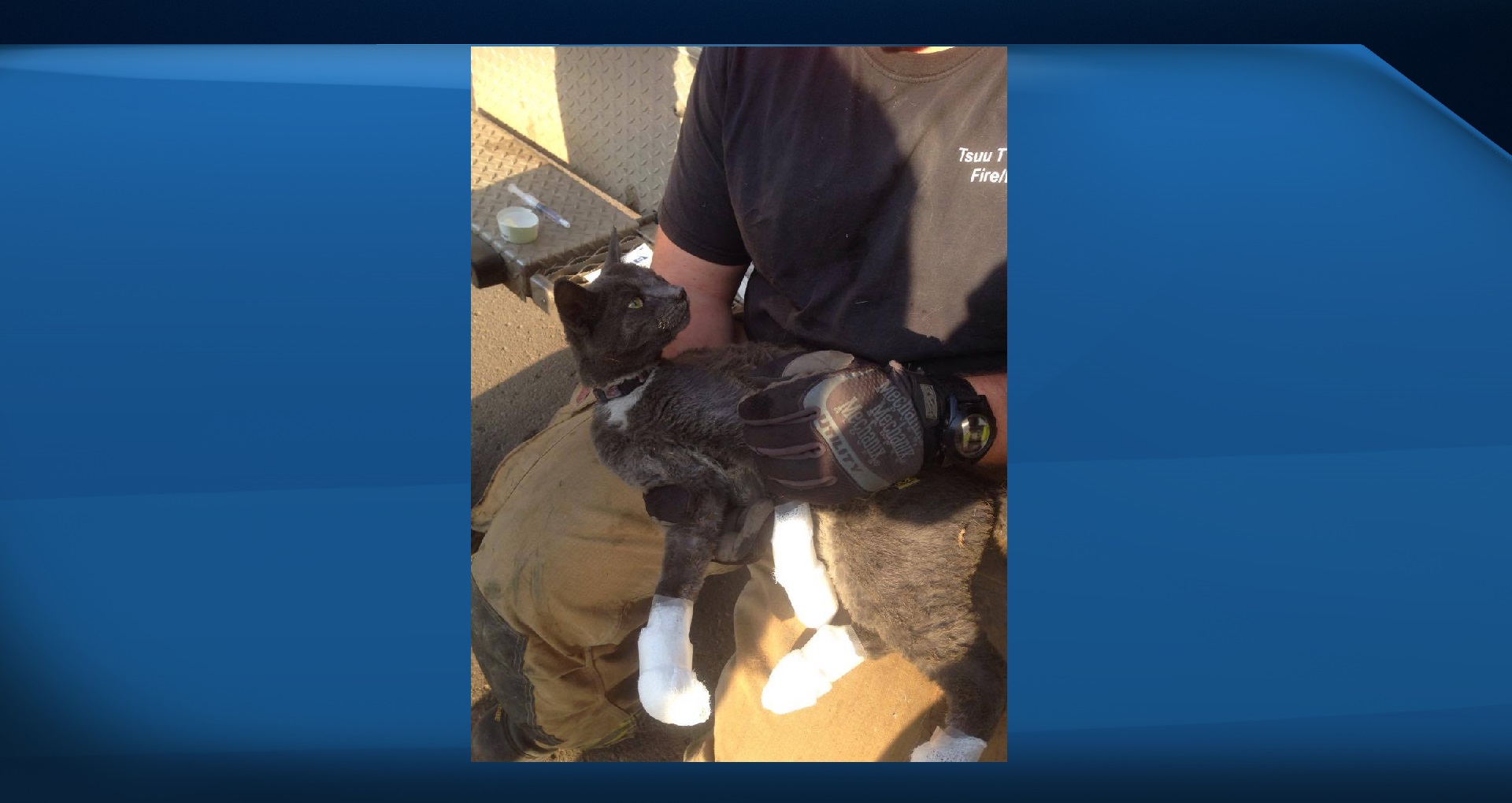 Lishchynsky says she was looking on social media when she saw pictures of a firefighter cradling a black cat with bandaged paws, and realized it was Tux.