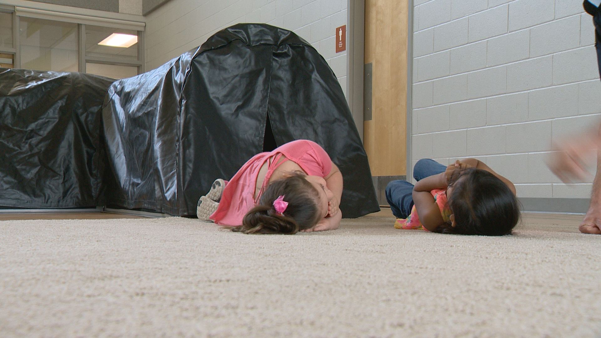 The scenario is a fire in the home where the youngsters must roll out of bed, and crawl through a dark tunnel, simulating smoke.