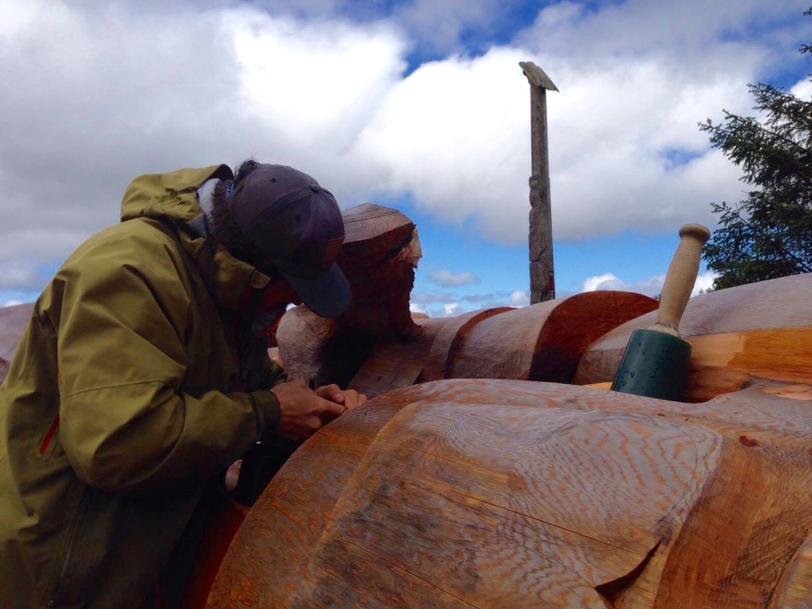 PHOTO: Haida artist Christian White working on his new totem pole in his carving shed