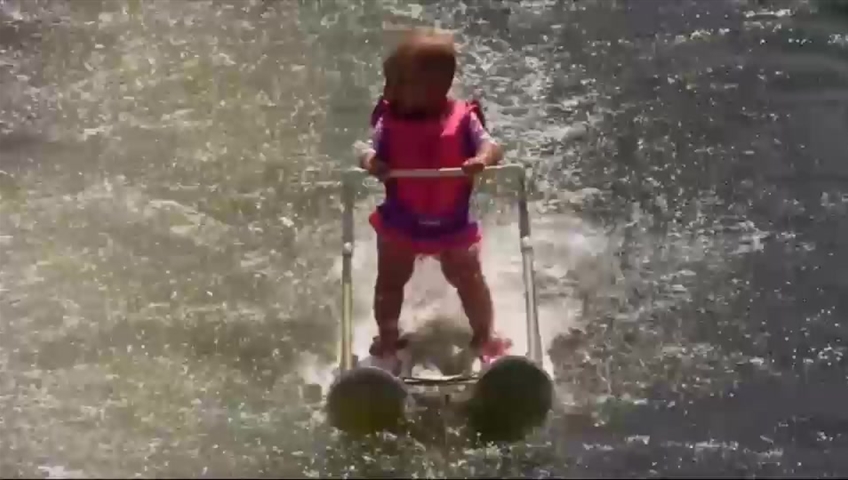 Video released by the World Barefoot Center in Florida shows Zyla St. Onge making two attempts to break the record for youngest water-skier.
