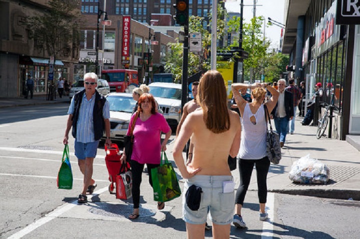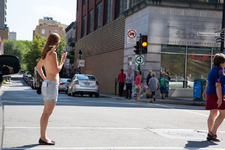 Standing on Sainte-Catherine Street, she took off her shirt and walked around the Gay Village and the Quartier Latin.
