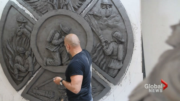 The piece is being carved in clay right now. When finished, he’ll make a plastic mould which will then be sent to a casting plant for it be bronzed. The final product will weigh a couple of tonnes and will likely be placed on a base that has the firefighters prayer carved into it. If all goes well, it could be done as early as September.