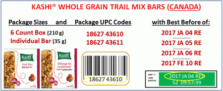 Kashi Trail Mix Whole Grain Bars, sold in packs of six with best before dates between January and February 2017, and Kashi Whole Grain Bars sold in packs of 18 with best before dates between September and November 2016 are being recalled.