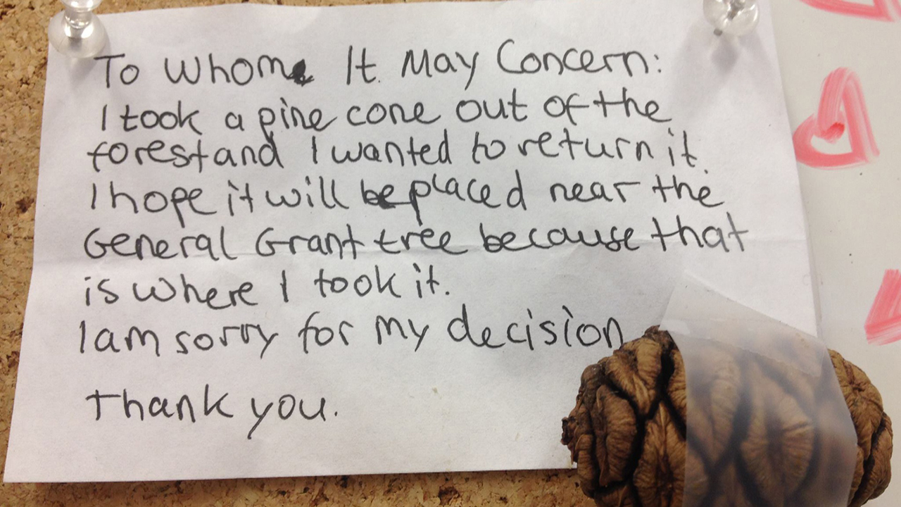 “To whom it may concern. I took a pine cone out of the forest and I wanted to return it. I hope it will be placed near the General Grant tree because that is where I took it. I am sorry for my decision. Thank you.”