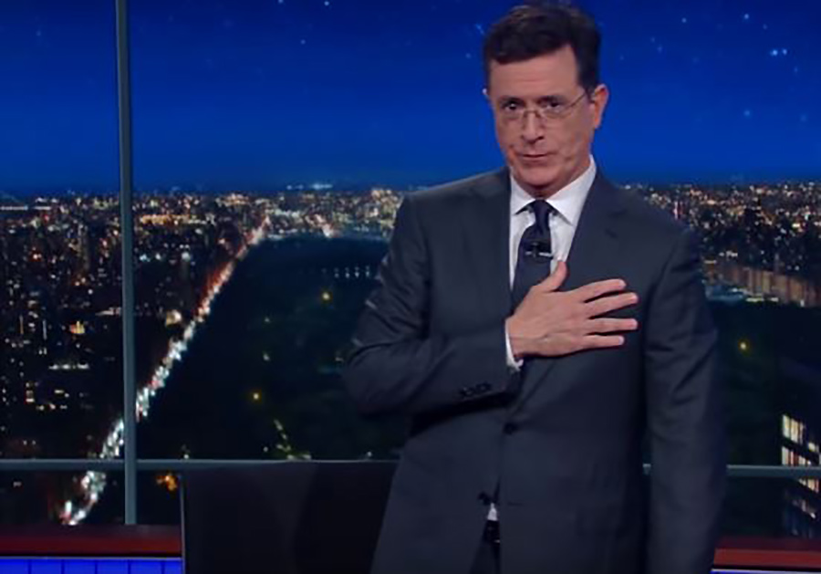 “Please rise — and place your hand over your beaver,” said Colbert as he introduced his version.