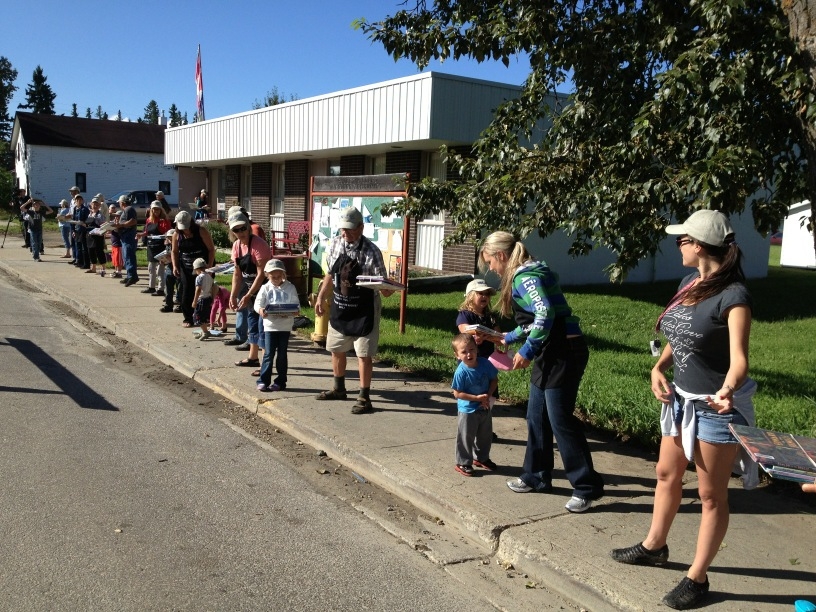 “We are making history here today in Alberta, because we are the first human chain library move in Alberta,” says Donna Mudge, who proposed the idea to the library board.