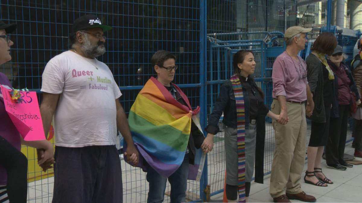 “He is trying to divide us and marginalize the communities of Muslims and Queers,” activist Imtiaz Popat told Global News. “So we are here standing united holding hands, saying that we are not going to be divided, sending a message to Trump and anyone like Trump with the same message, because what he says affects us here as well.”