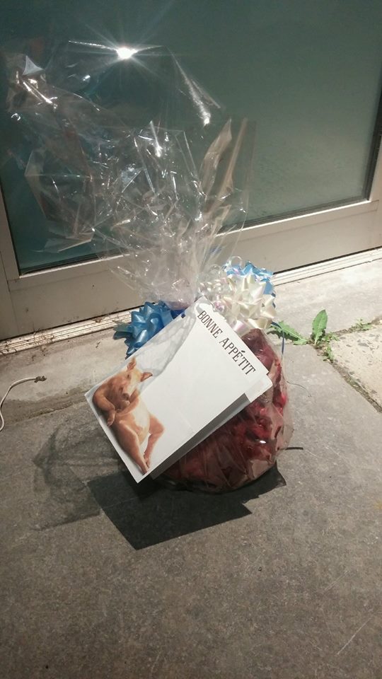 A pig’s skull, wrapped up like a gift basket was dropped off Saturday night at the centre with an anonymous card that read “bonne appetit.”