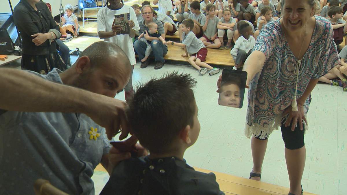 He chose the second-to-last day of school to cut his locks and sport a new ‘do’, with the help of hair stylist David Devico.