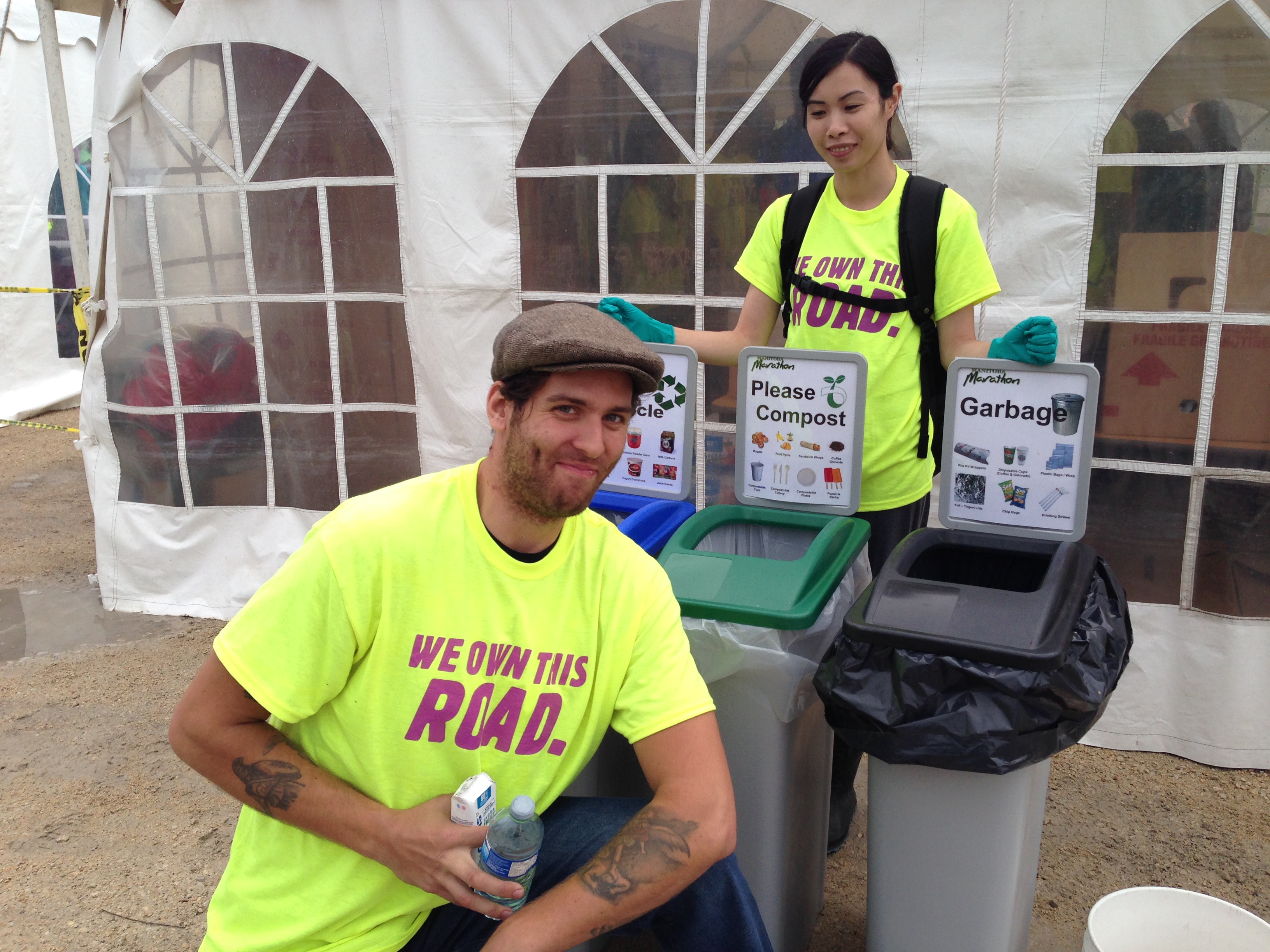 At the University of Manitoba stadium, where the races start and finish, any packaging from water and snacks are put into special pods. Each pod includes a recycling bin, compost bin and waste bin. Green Team volunteers monitor each pod to ensure things are ending up in the correct bin.