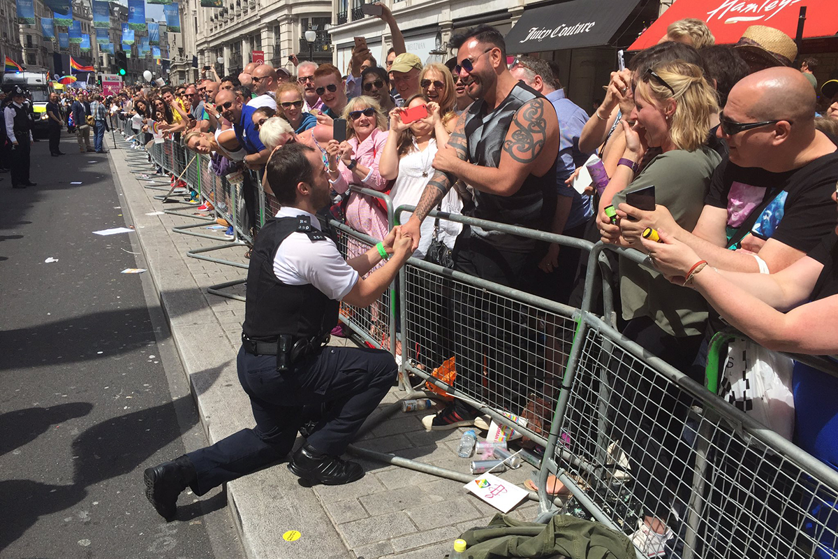 Across the Pond, a pair of patrolmen proposed to their partners during the London Pride parade one day earlier.