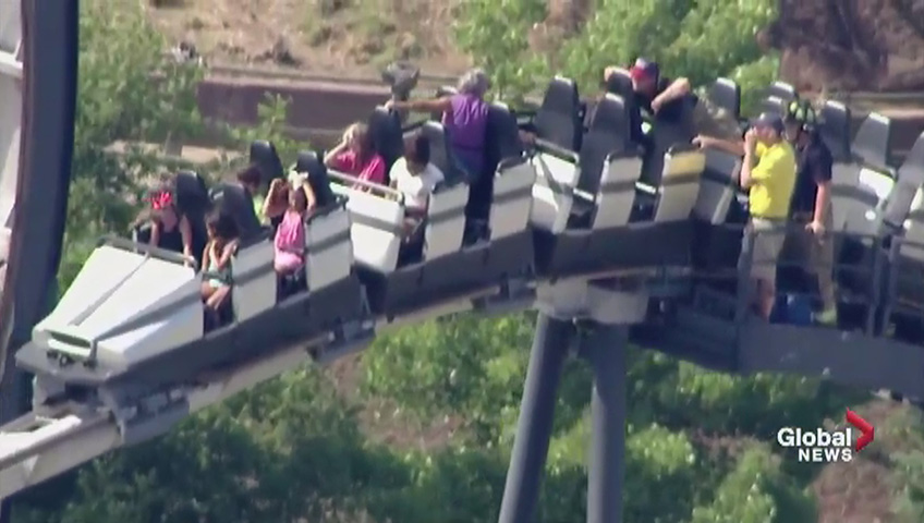 Emergency personnel worked to rescue the roller-coaster’s passengers, who were stranded atop the amusement park ride after it stopped functioning.