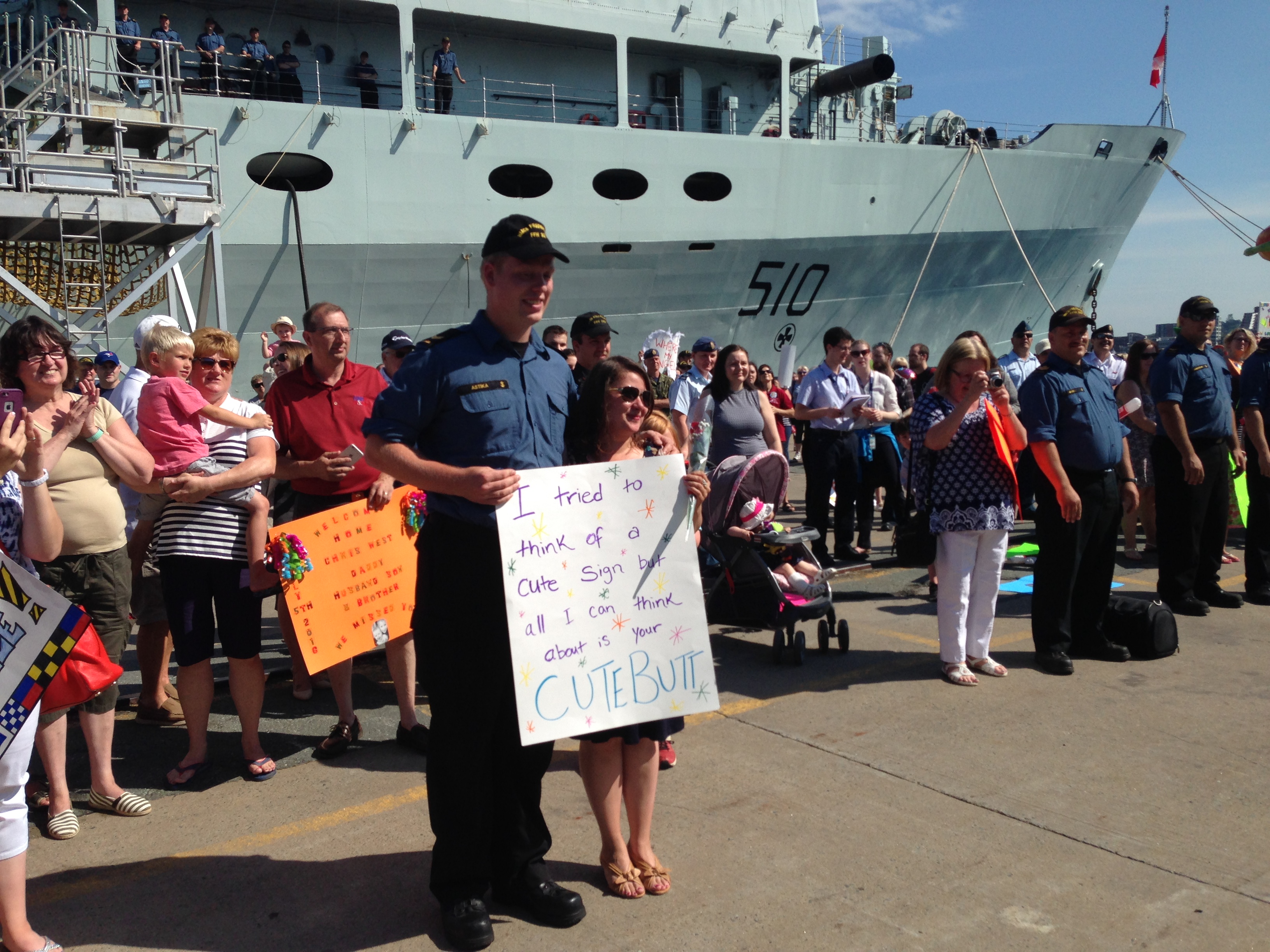 Hundreds of family members and friends gathered on the jetty with signs, teddy bears, flowers and hugs for the 250 crewmembers.