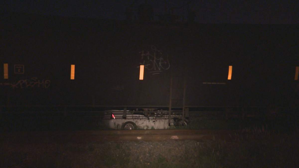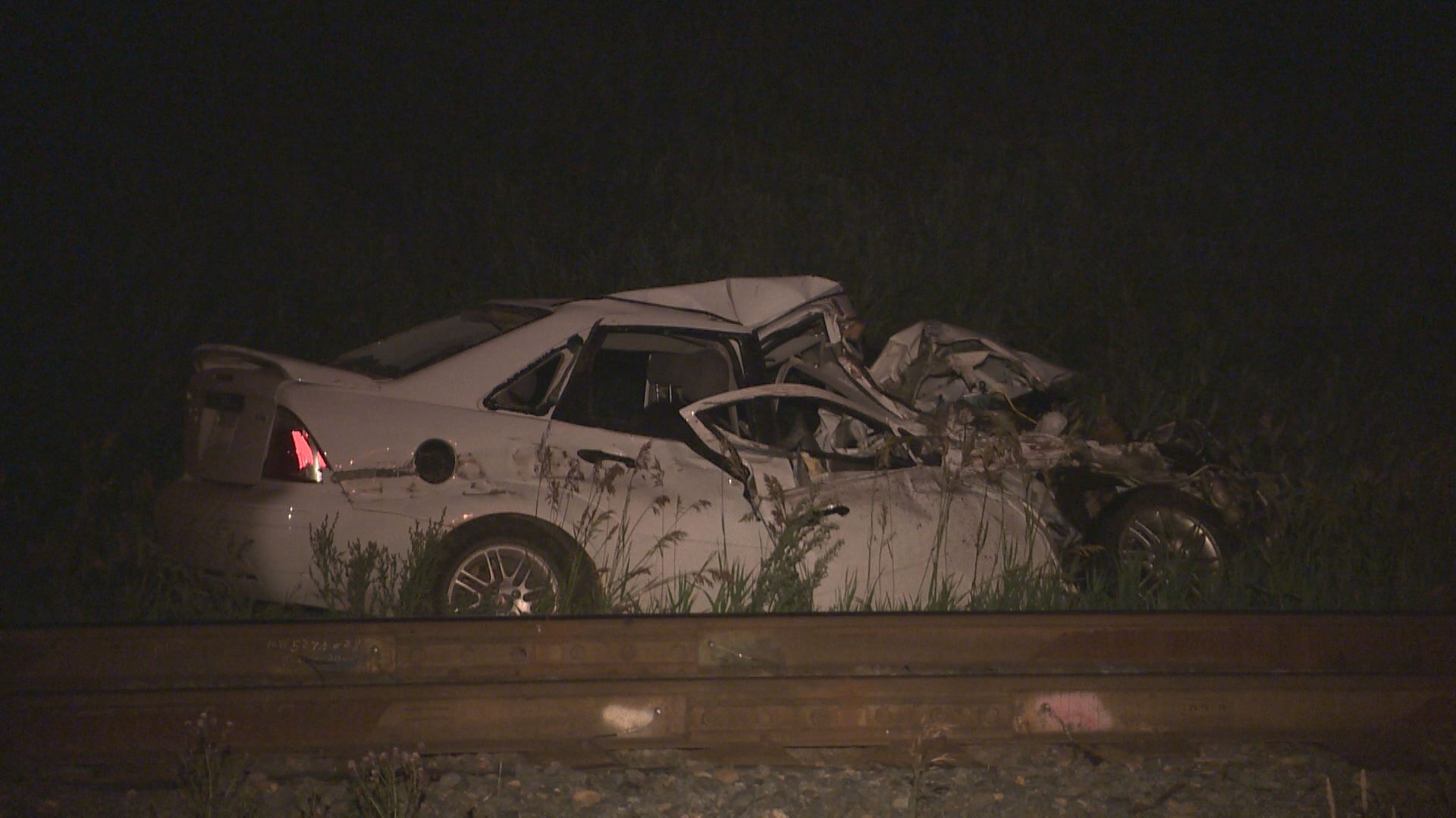 A car was driven into the side of a moving train near Fort Road and 153 Avenue in northeast Edmonton around 2 a.m. Wednesday. July 6, 2016. Global News