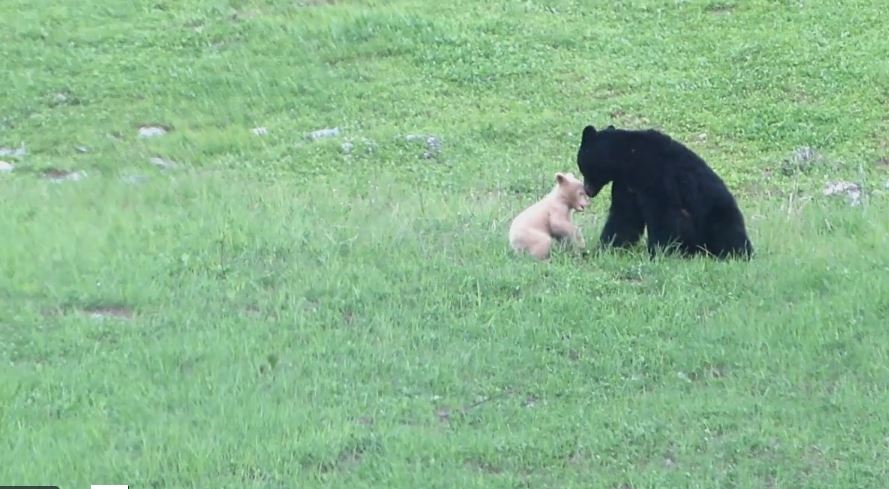 The video shows the cub playfully wrestling with its mother – a black bear that is well-known in the area.