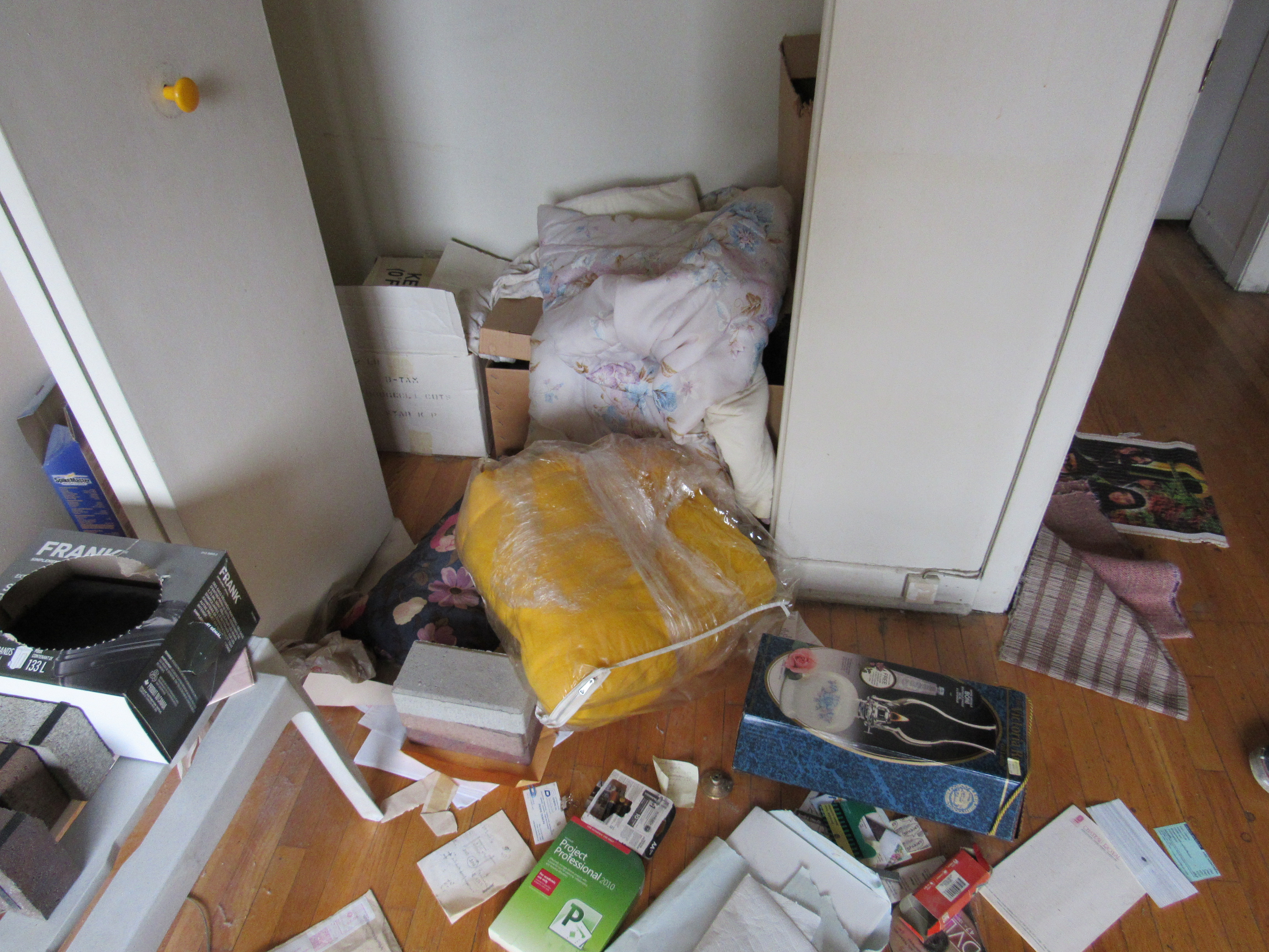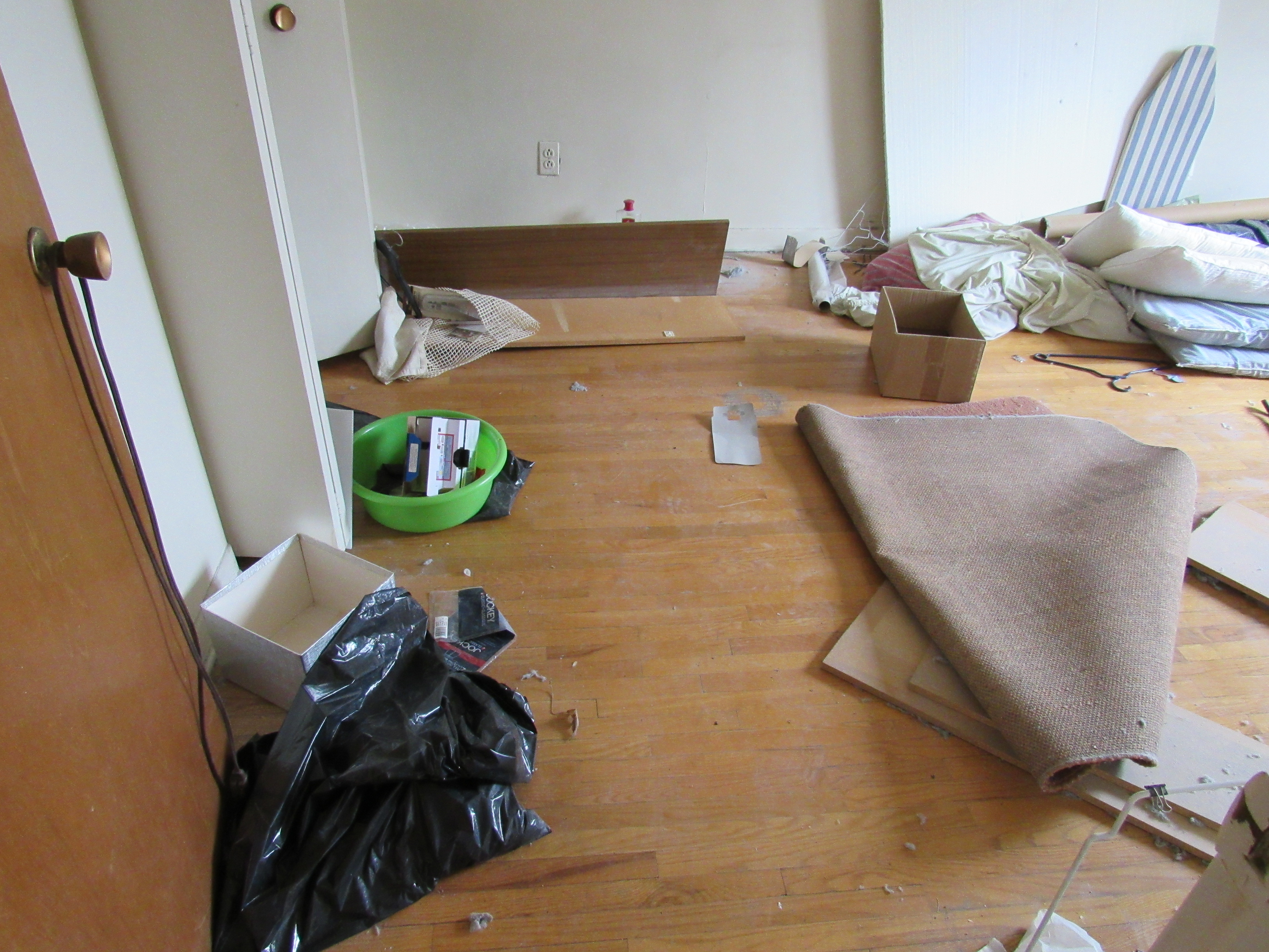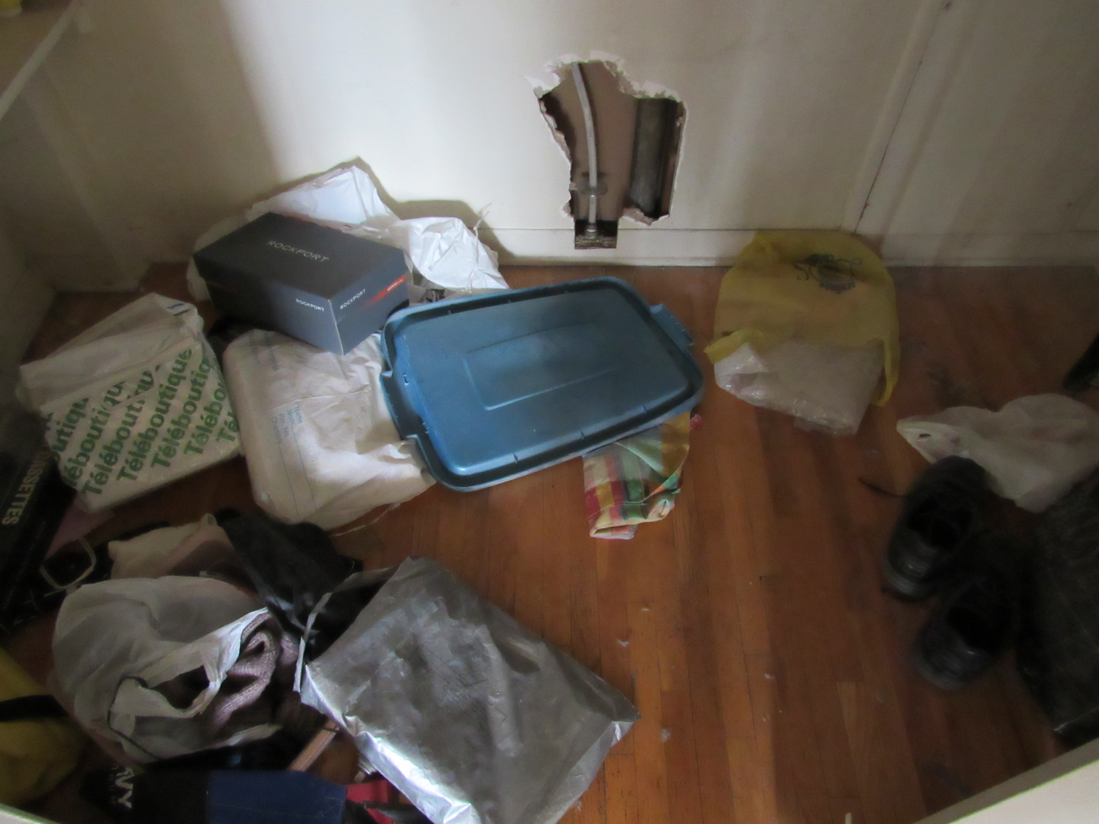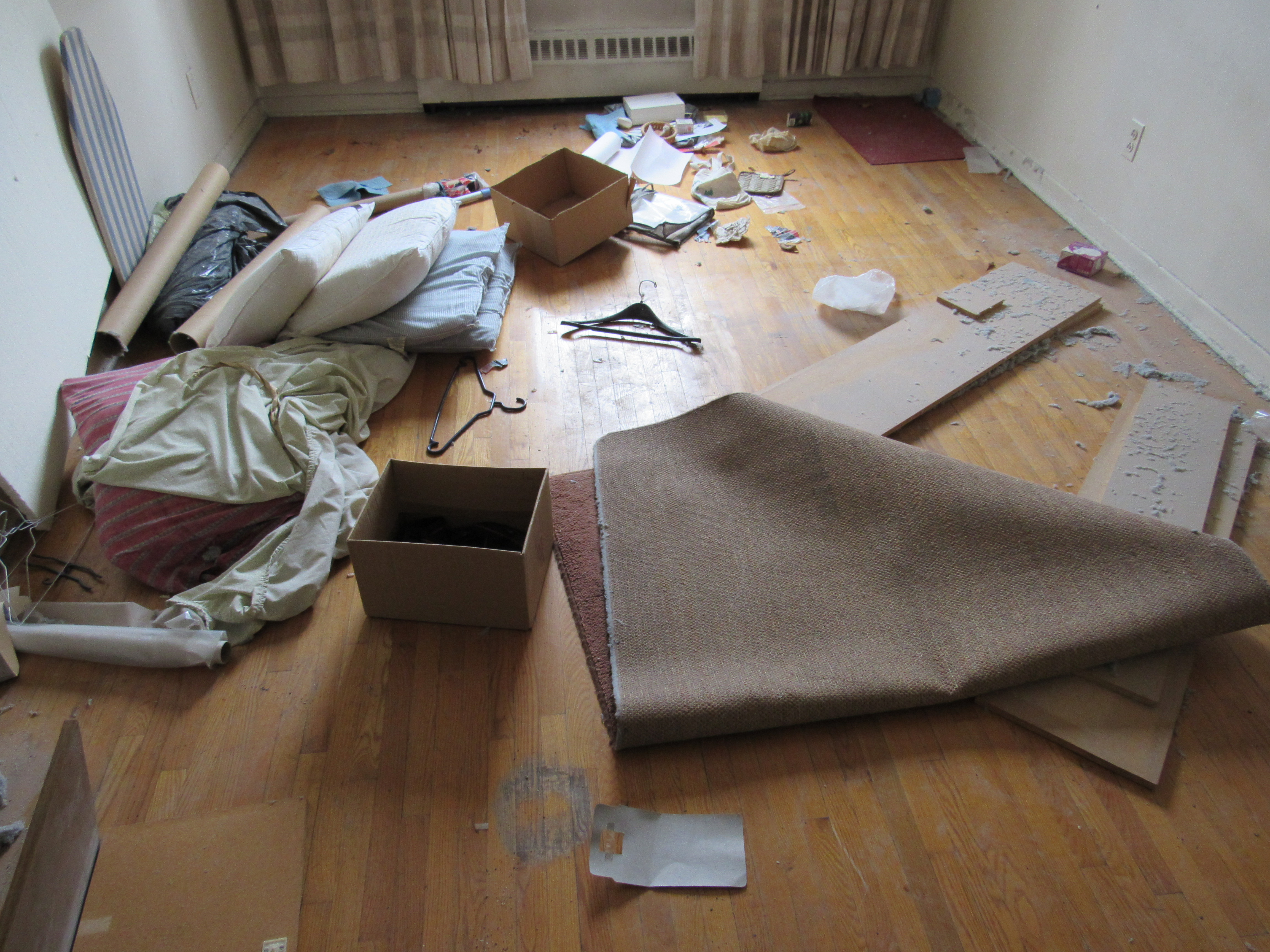 Items left behind included an old carpet, a pair of shoes, a few pillows and several garbage bags, all strewn across the floor in disarray.