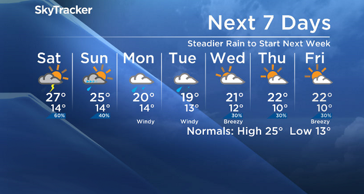 As such temperatures are expected to be a few degrees cooler on Sunday, but still hitting a high in the mid-20s with a humidex making it feel a few degrees warmer.