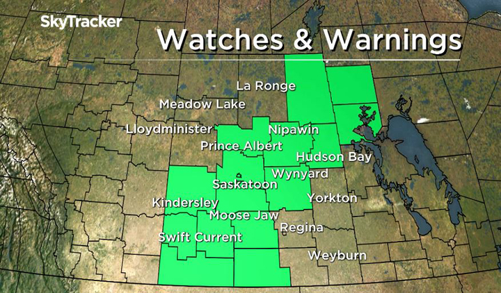 A rainfall warning remains in place for areas in Saskatchewan, with the warned area extending down to the U.S. border.