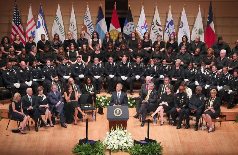 Speaking at the memorial, President Obama said the shootings of five Dallas police officers would appear to have exposed the “the deepest fault line of our democracy” but that Americans must reject such despair.