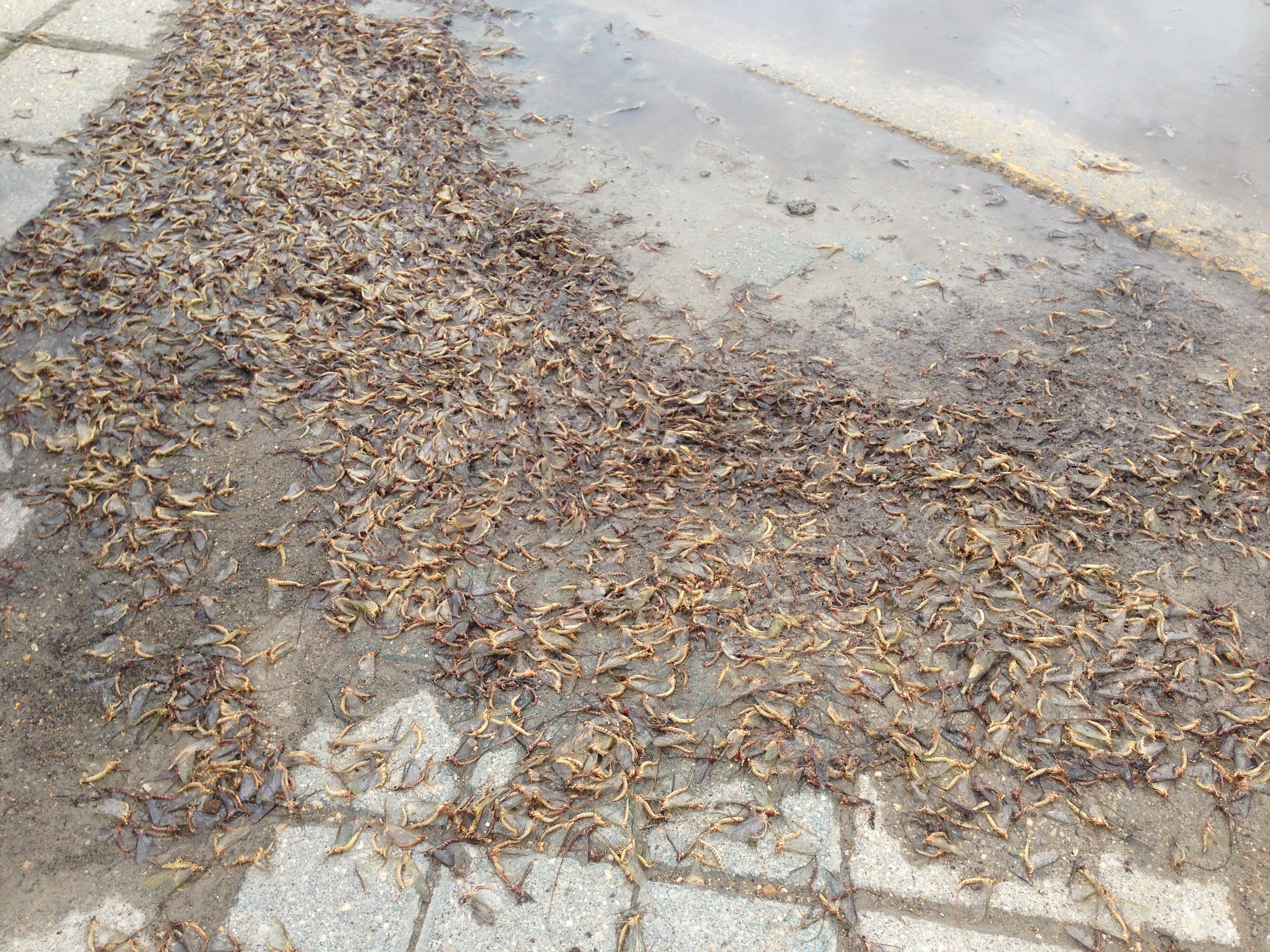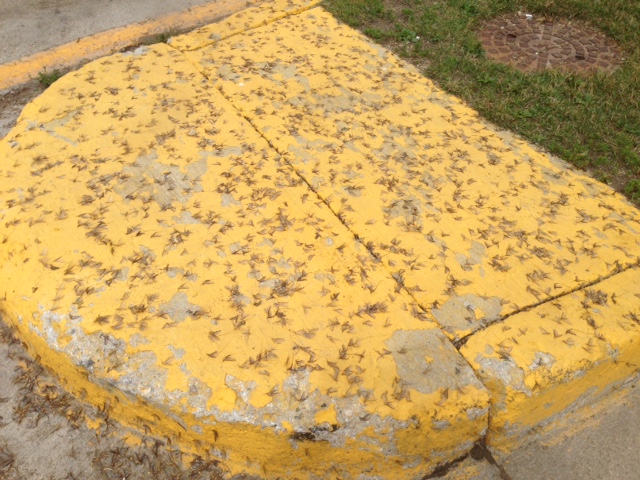 No matter where you look, the fish flies have taken over. The outside walls of buildings are completely covered, picnic tables are unusable and boats are coated in the insects.