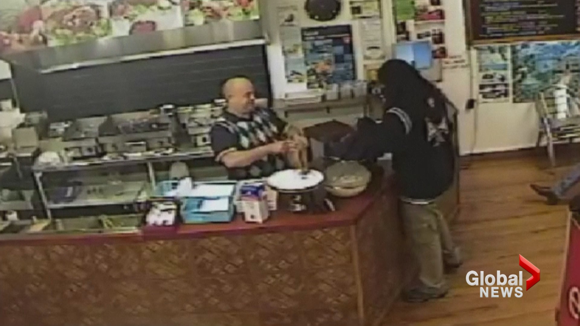 New Zealand police have released security footage of an attempted robbery at a Christchurch kebab shop showing the owner continuing to serve a customer while the armed robber points a gun at him.