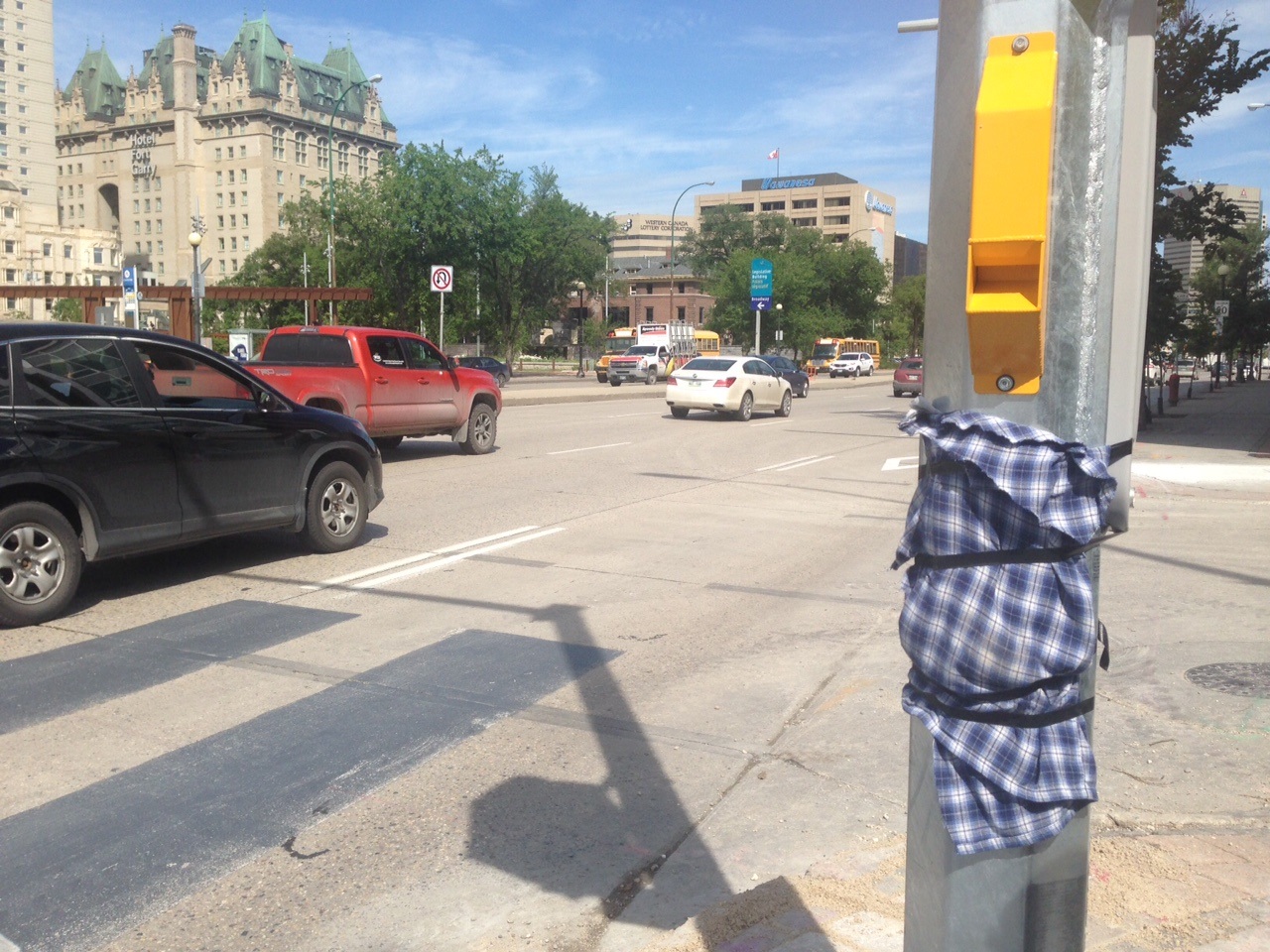 WINNIPEG — Pieces of what appeared to be flannel shirts were covering the crosswalk buttons over one of Winnipeg’s busiest streets this morning, in a possible attempt to alert pedestrians the crosswalk signals were not working.