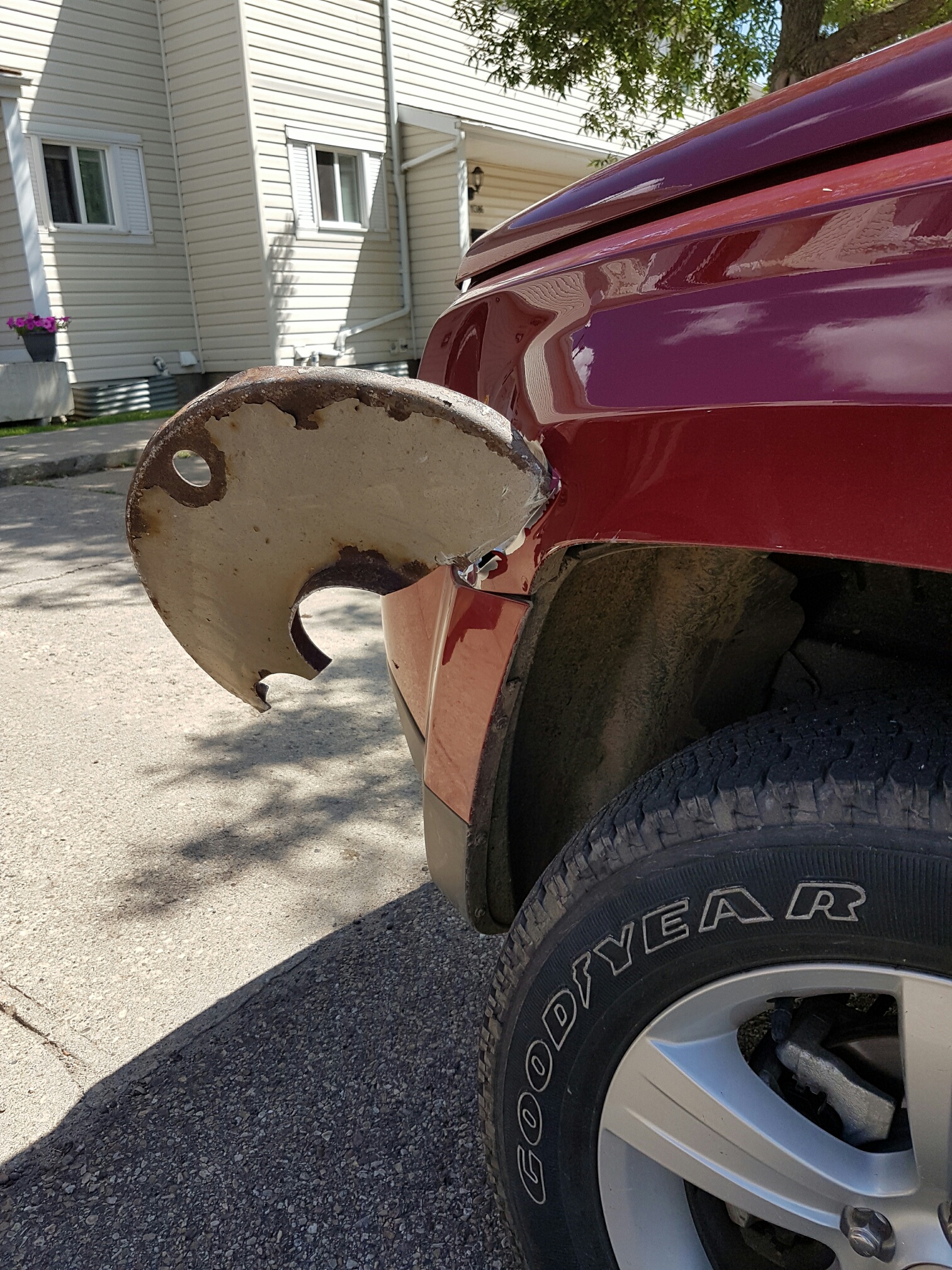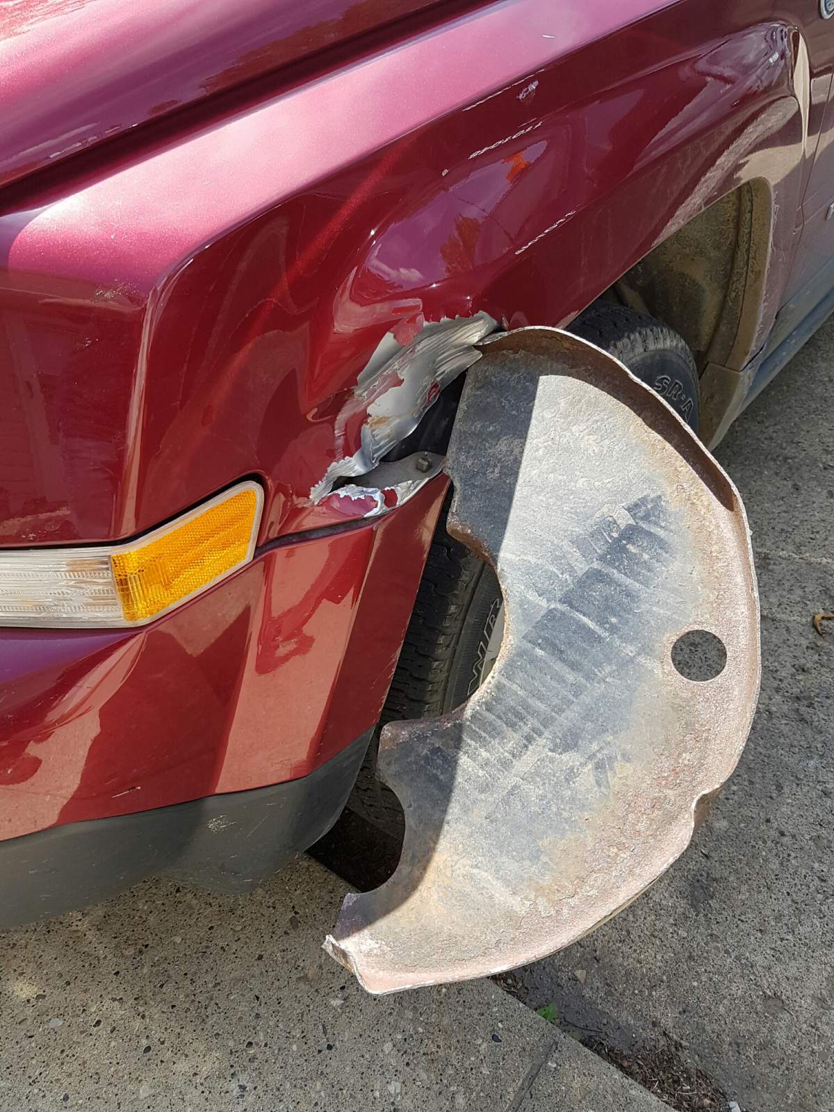 “I got out and looked, and there was that disc sticking out of the fender!”