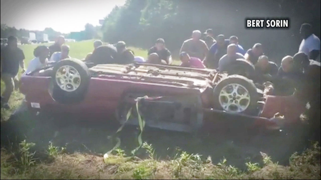 WATCH: Dramatic video shows about 12 to 15 people helping to flip a car over after the driver lost control of his vehicle in South Carolina on Tuesday. Chad Mills reports.