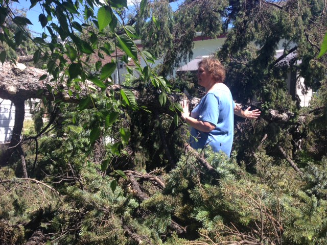 “We heard about the big storm through our neighbours who called us while we were at the store. They said our big pine tree fell in your backyard and so when we got home this is what we saw. We saw that there were downed power lines,” said Lucille Champagne-Kwiatkowski.