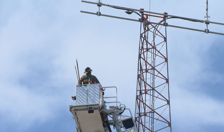 A merlin falcon tangled in the wires of an antenna tower was rescued Friday by Saskatoon Fire Department crews.