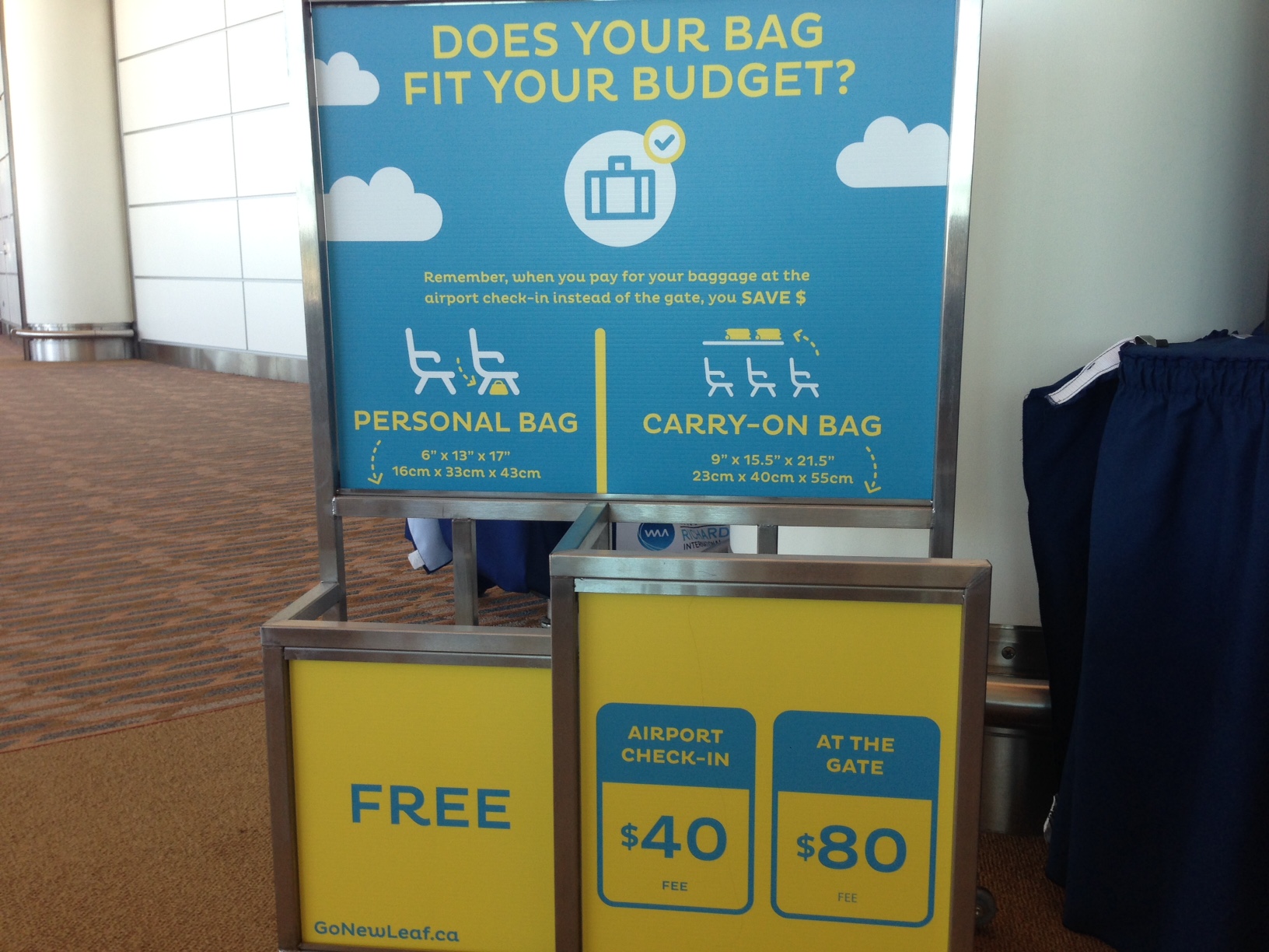NewLeaf charges for carry-on bags. If you pre-pay for your carry-on from home it will cost $31.50. However, if you need to make a last minute check-in at the gate for that carry-on bag it will set you back $80.