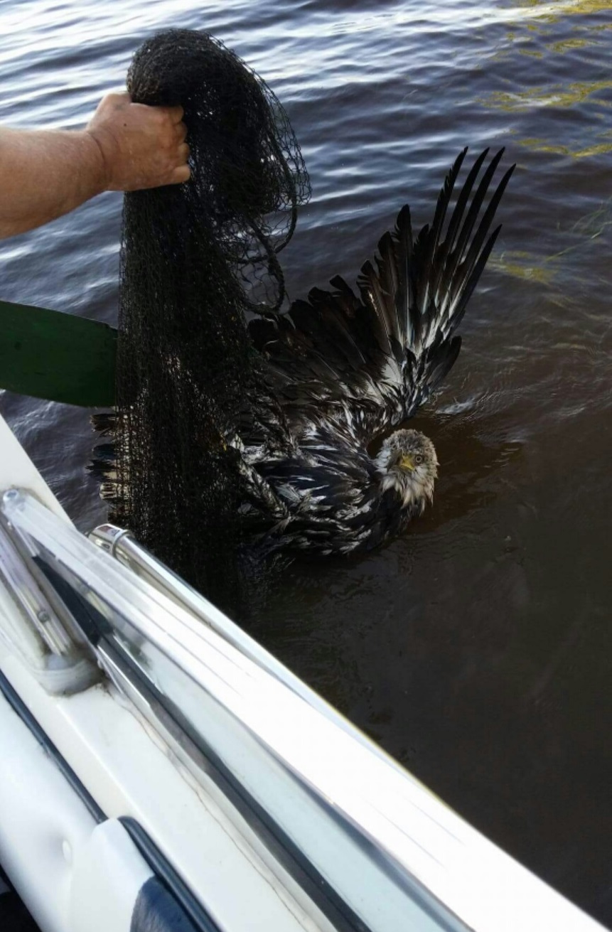 Stewart says the bird beat them with its wings, but after about half an hour, they were able to free the eagle.