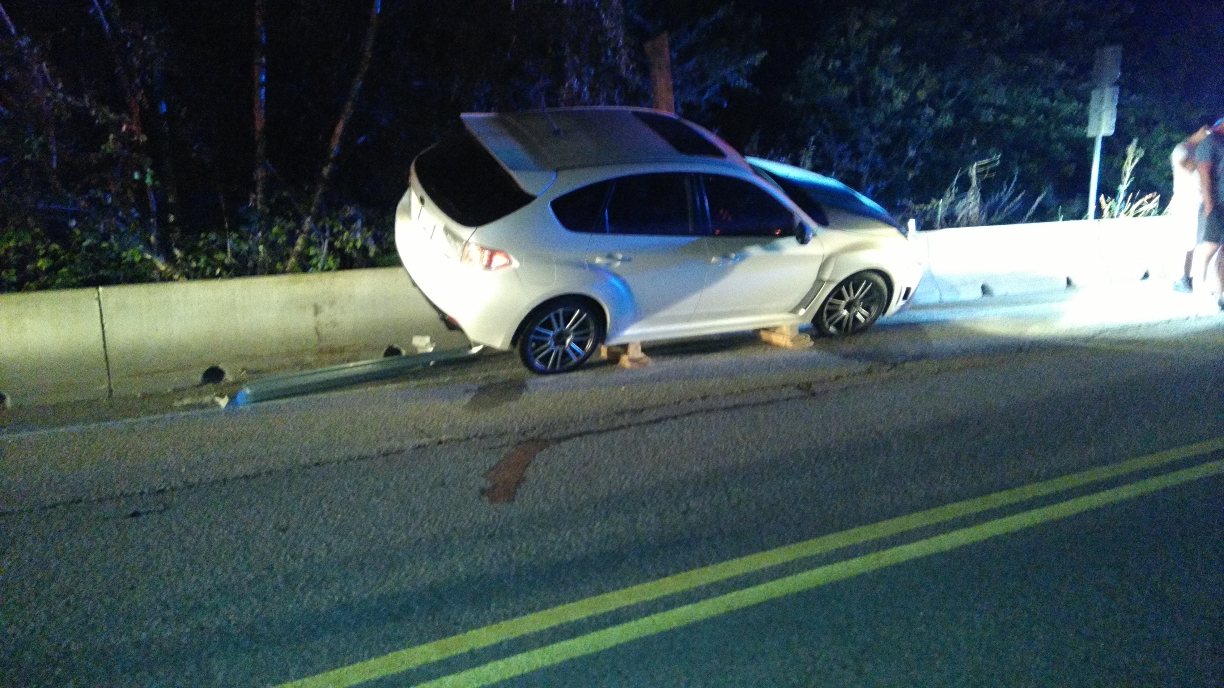 A vehicle ended up stuck on a roadside barrier in Naramata late Sunday night, but no one was seriously hurt.