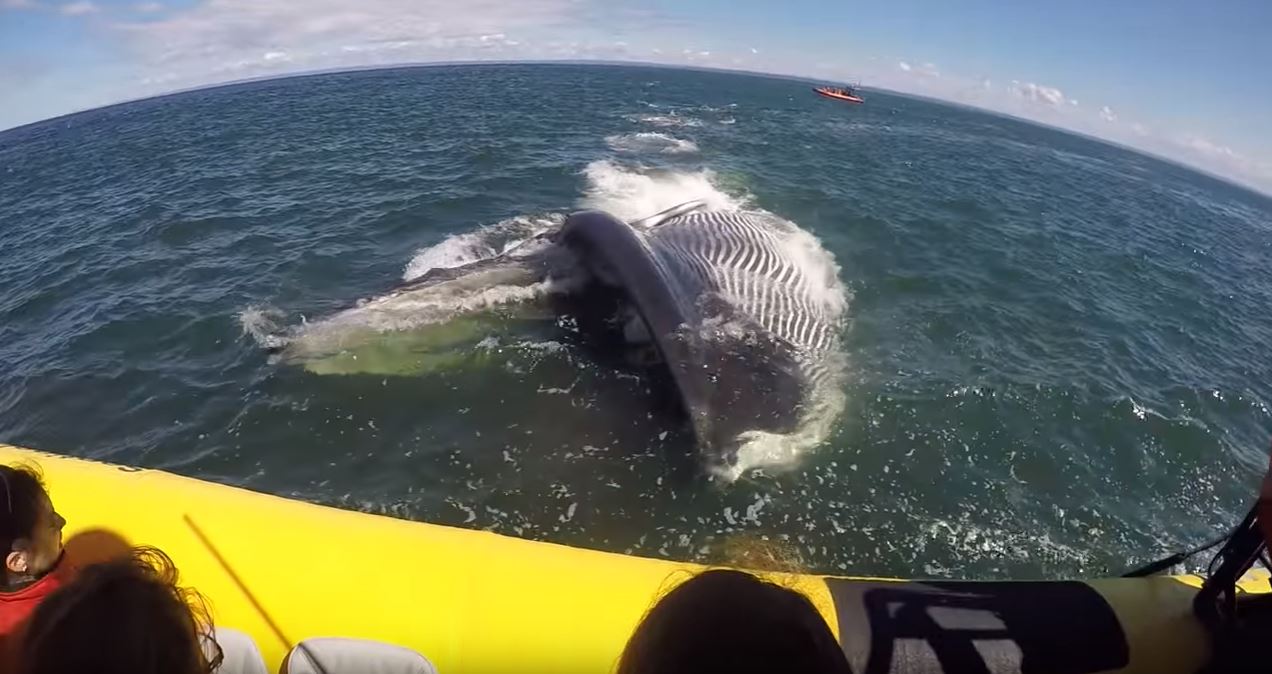“There, there’s two!” people can be heard yelling before crying in glee as the whale approaches the yellow boat, its mouth wide open, belly in the air before dipping back underneath.