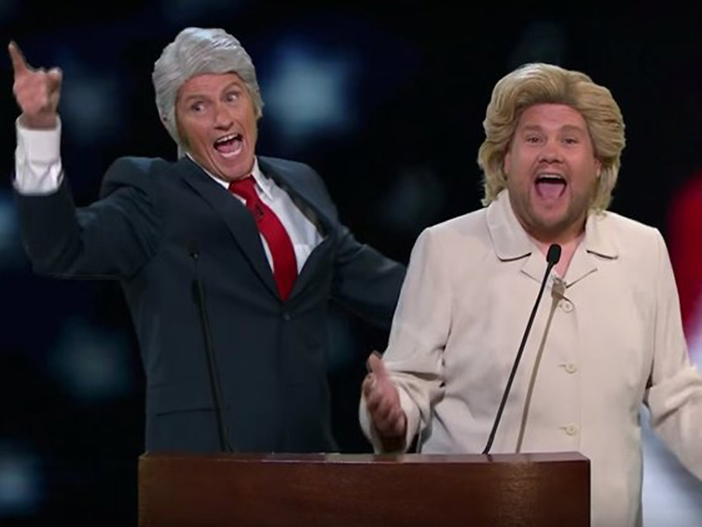 Host James Corden joined Leary in song, wearing his best Hillary Clinton outfit.