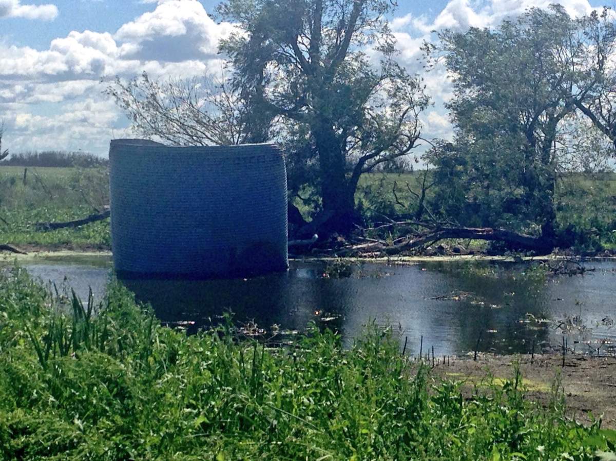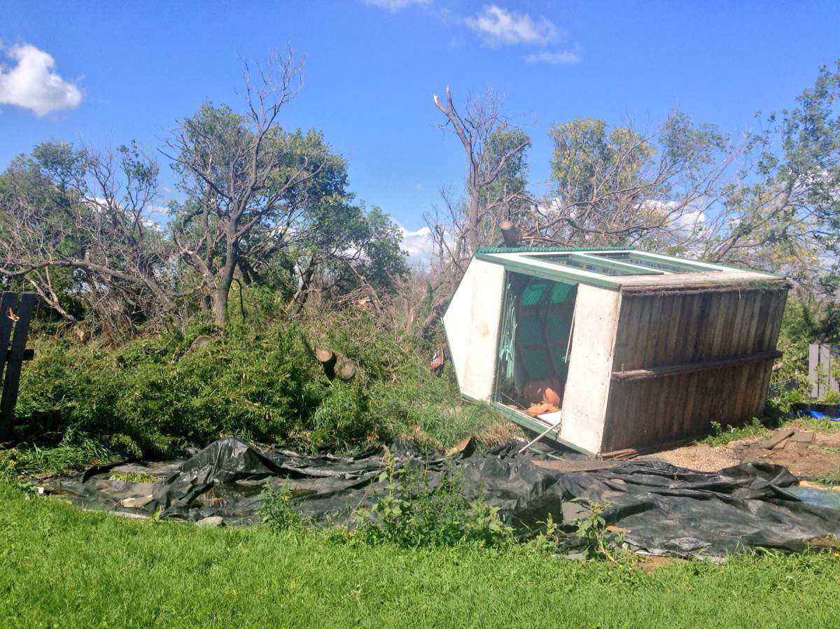 Luckily, the grain bin was stopped by a slough beside the house. But a greenhouse, garage and multiple trees sustained heavy damage. Holt herself was uninjured, but was left shaken by the experience.
