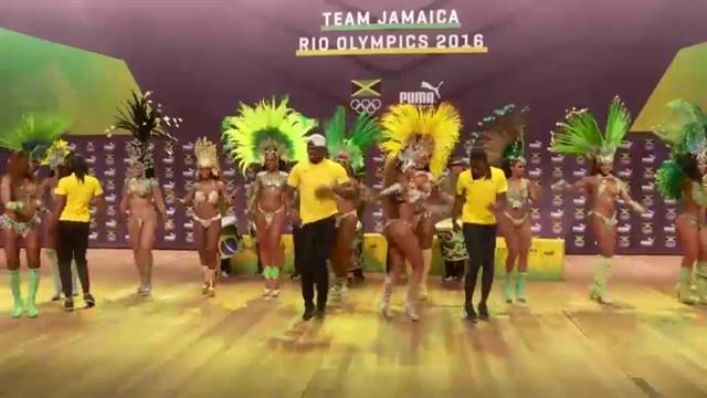 Three-time Olympic champion Usain Bolt transformed a news conference into a show on Monday, showing his fancy footwork with a group of samba dancers and showing off his trademark celebration “lightning bolt“.