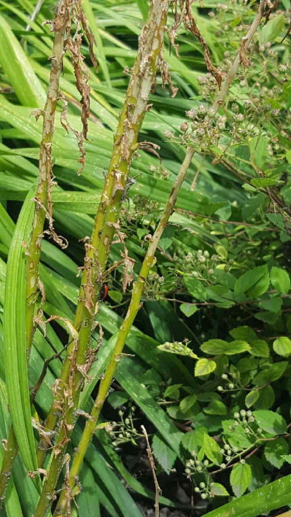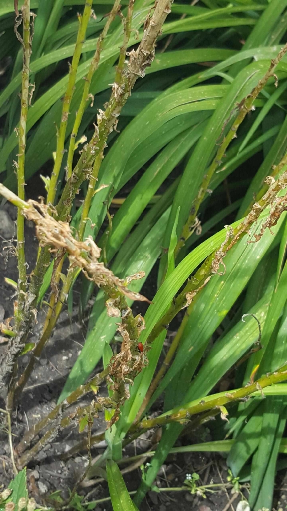 There’s nothing ladylike about what the hungry little lily beetles have done to Gore’s lilies. The flowers are gone and the leaves are spotted with holes.