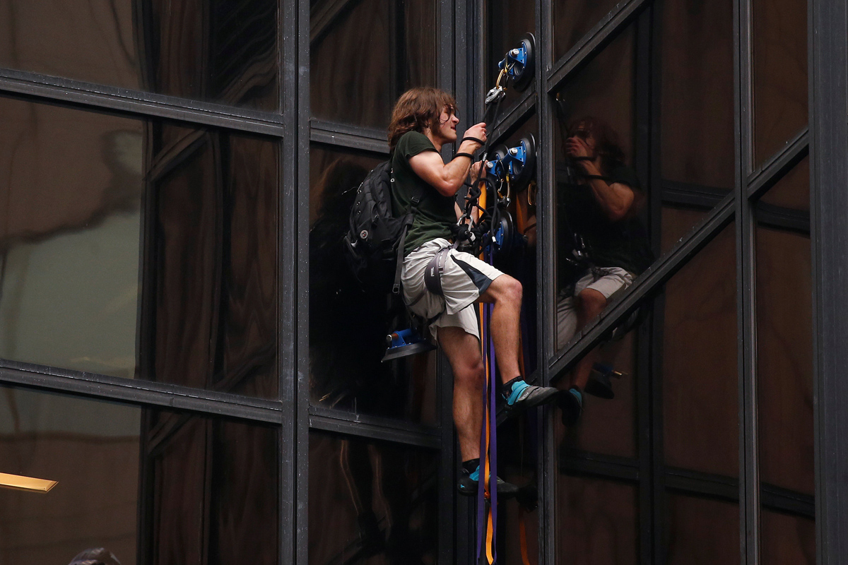 The climber, identified by police as a 20-year-old Virginia man, wore a backpack and used a harness and rope stirrups to fasten himself to the side of the 58-story Manhattan skyscraper.