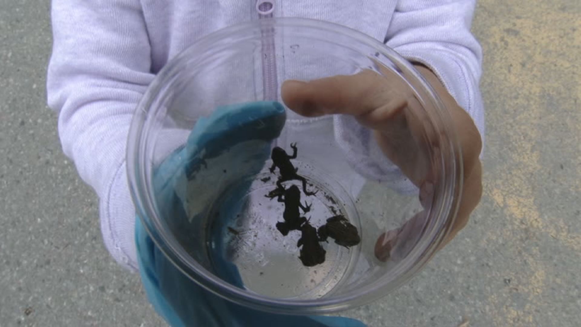 Dozens of volunteers are using sticks, leaves and their glove-covered hands to herd an estimated 50,000 migratory Western Toadlets away from a road and bike path at Lost Lake. The road is shut down and cyclists are urged to watch out for the tiny amphibians.