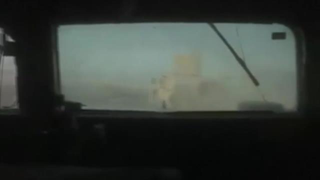 The video shows the convoy driving down a dusty road with the sound of gunfire and shouting in the background.