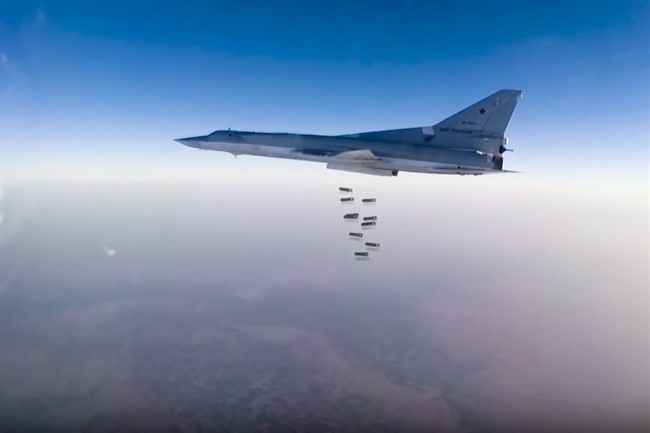 The Russian ministry’s statement said Su-34 and Tu-22M3 bombers took off earlier in the day to target Islamic State and the Nusra Front militants in Aleppo, as well as in Deir el-Zour and Idlib provinces, destroying five major ammunition depots, training camps and three command posts.