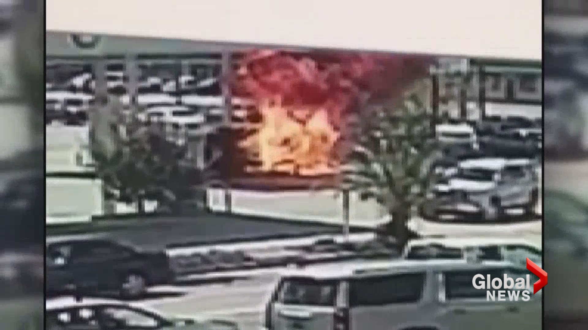 The fire sent flames shooting above the awning covering the fuel pumps, while a huge cloud of black smoke filled the sky.