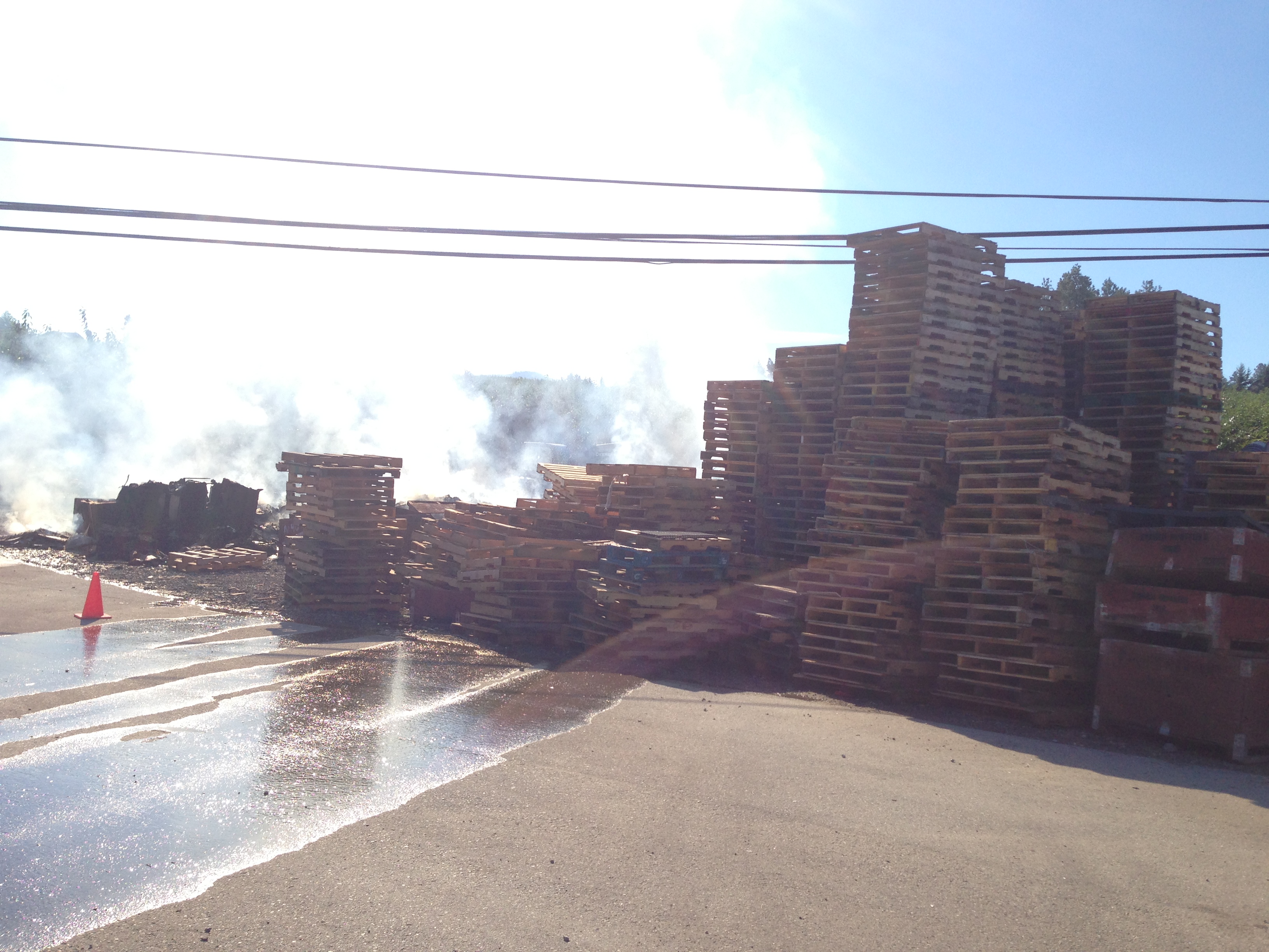 A stack of bins and some pallets of cardboard boxes were in flames. No buildings were threatened but some overhead telephone and data wires were close to the fire.