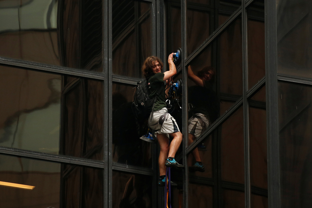 At one point, a laptop he was carrying in his backpack fell out, crashing on the ground below as he plodded along from a fifth-floor atrium to the 21st floor, where he was hauled in through an open window by police detectives, Griffith said.