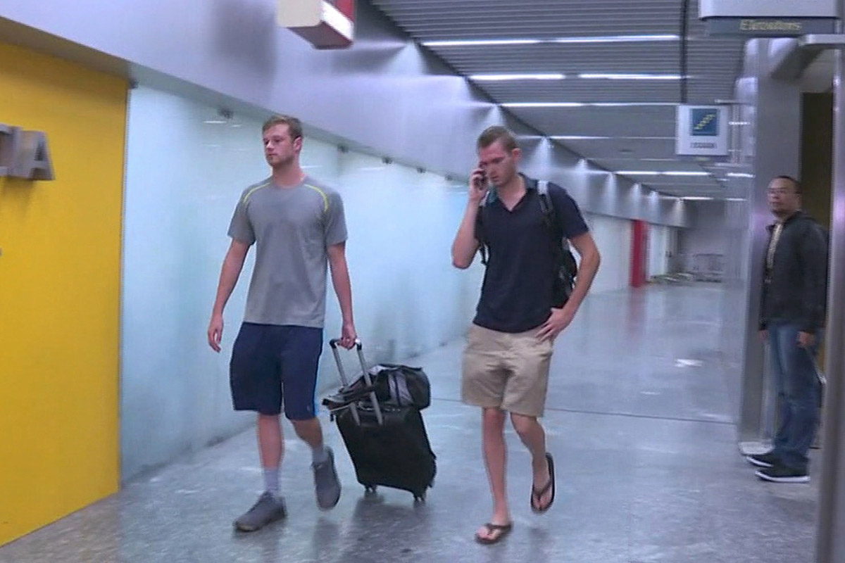 Jack Conger and Gunnar Bentz left the Rio de Janeiro airport early Thursday after being taken off the plane Wednesday. They departed for an unspecified location in Brazil and had yet to testify, said attorney Sergio Viegas. The swimmers did not speak to reporters as they left the airport and were shuttled away in a black car waiting outside.