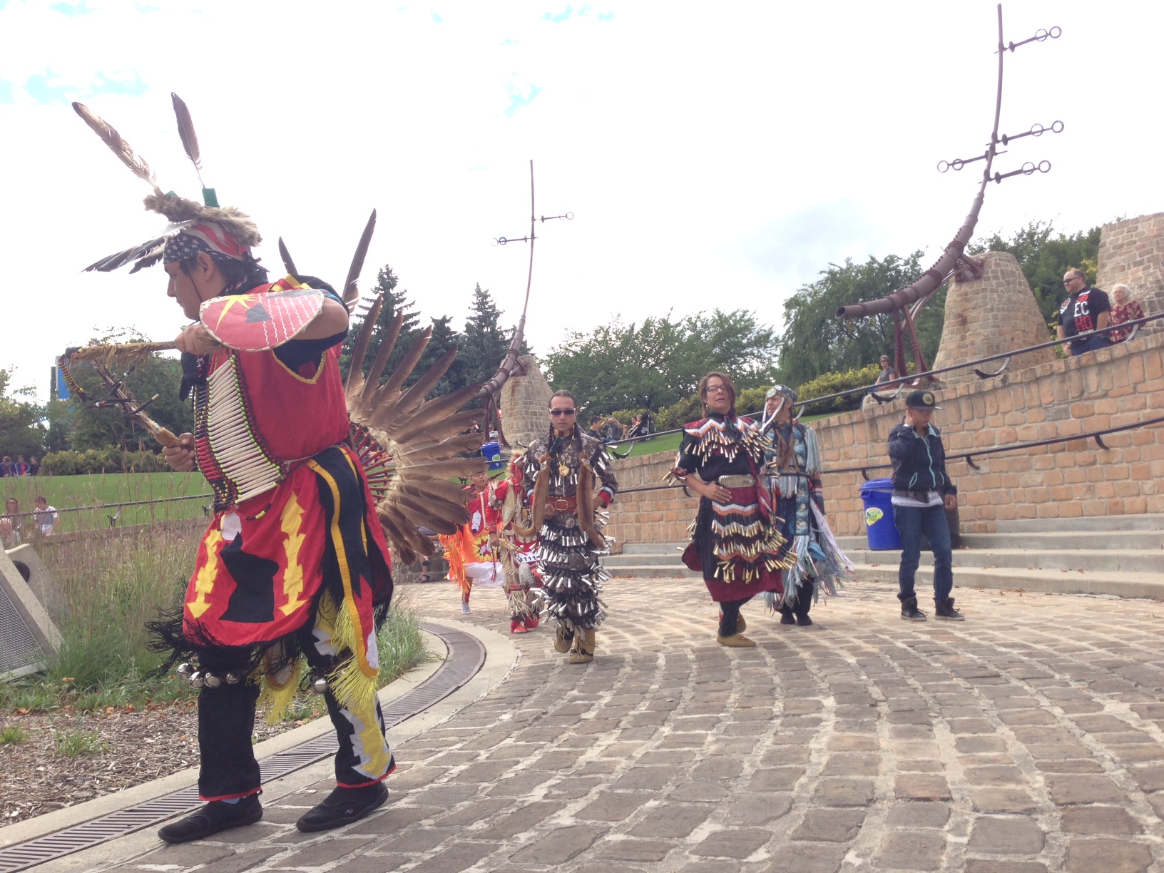 A group called Founding Nations of Manitoba Tribal Village performs the dances while dressed in ceremonial garments.