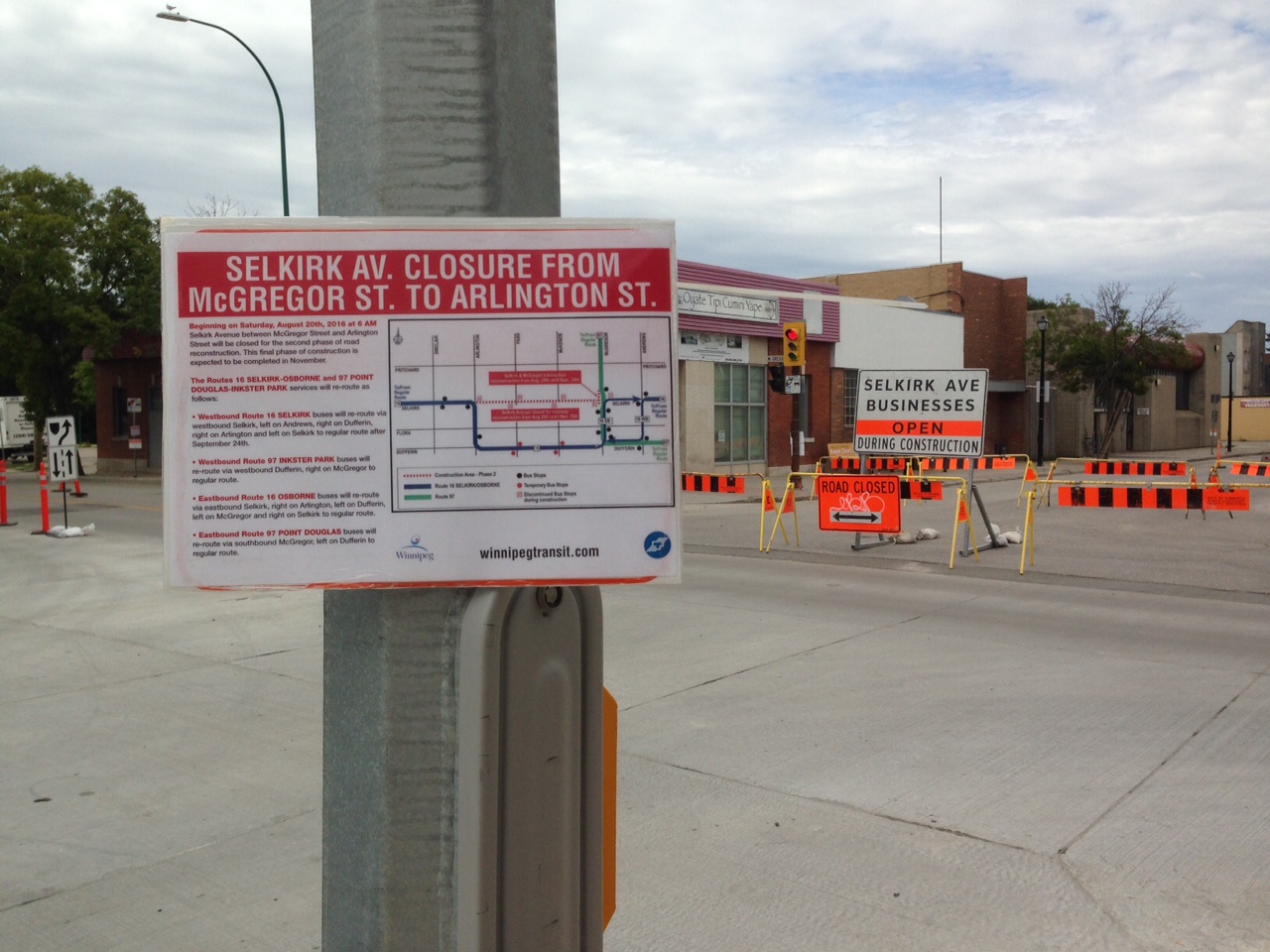 Selkirk is now closed between McGregor St. and Arlington St. until at least mid-November for phase two of the road renewal project.